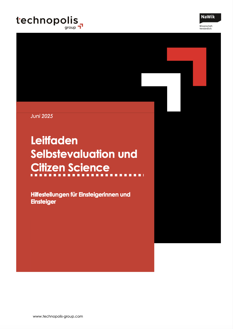 Im Rahmen der Evaluation der Bürgerforschungsaktivitäten des BMBF hat das Evaluationsteam von Technopolis und dem NaWik einen Leitfaden zum Thema Selbstevaluation und Citizen Science erarbeitet. Den Leitfaden können Sie hier herunterladen.