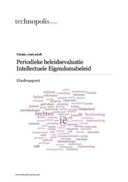 The Ministry of Economic Affairs has asked Technopolis to carry out an evaluation of the Intellectual Property Policy of 2012-2017. This evaluation focused on IP rights that are most important for innovative entrepreneurship. It is not only the protection of intellectual property that is relevant, but also, and above all, its use to promote innovation and R&D. The analysis covers patent law, plant variety rights, trademark & design rights, copyright & database rights and trade secrets. The evaluation made use of an extensive literature and case law study, interviews, an international comparison, patent statistics, a survey and a focus group.
