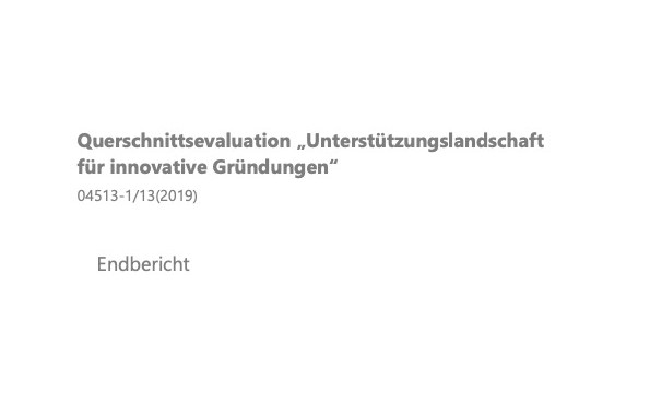 Von Mai 2020 bis Oktober 2021 waren das Fraunhofer Institut für System- und Innovationsforschung ISI, die Technopolis Deutschland GmbH und das ZEW – Leibniz-Zentrum für Europäische Wirtschaftsforschung GmbH mit der Durchführung einer Querschnittsevaluation zur Unterstützungslandschaft für innovative Grün dungen beauftragt. Sie untersuchte die Wirkungen, Synergien und Komplementaritäten innerhalb des Ge samtangebots zur Vorbereitung und Unterstützung von innovations- und forschungsbasierten Gründungen der beiden Bundesministerien für Bildung und Forschung (BMBF) und für Wirtschaft und Energie (BMWi).