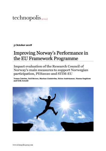 The Research Council of Norway (RCN) commissioned Technopolis Group to conduct an impact evaluation of its two main support measures to enhance Norwegian participation in Horizon 2020, PES2020 and STIM-EU. Any organisation that may receive RCN funding is eligible for PES2020 support, but only research institutes are eligible for STIM-EU support.The evaluation concludes that PES2020 is associated with increased FP activity, with some additional proposers and with slight quality improvements to proposals, but these relationships do not all apply equally to all stakeholder categories.