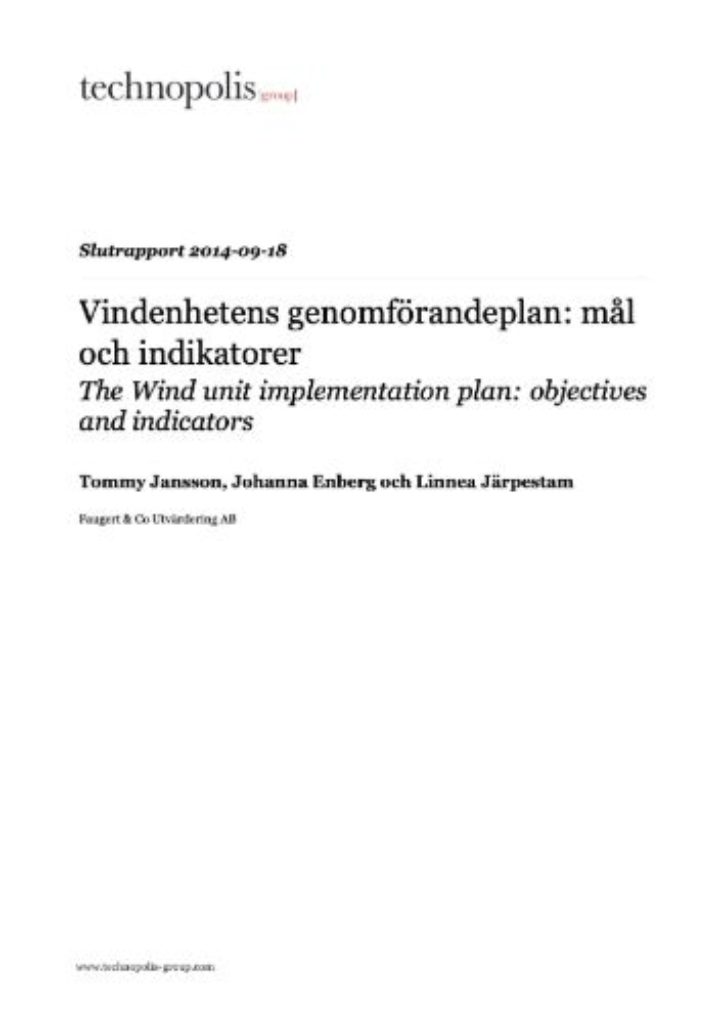 Technopolis Group assisted the Swedish Energy Agency in their work with an activity plan for their wind unit. The analysis discussed targets and indicators for the unit, and led to a workshop discussing which targets may be most appropriate given the wind unit’s mission and resources. The aim of the assignment was to provide the unit’s employees an increased understanding of how to create and formulate relevant and useful targets and indicators. Based on this understanding they were to discuss how the implementation plan may be developed and made more specific. The assignment, and not least the workshop, contributed in a structured way to discuss these issues.
